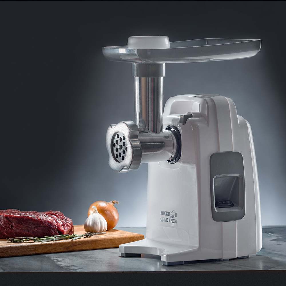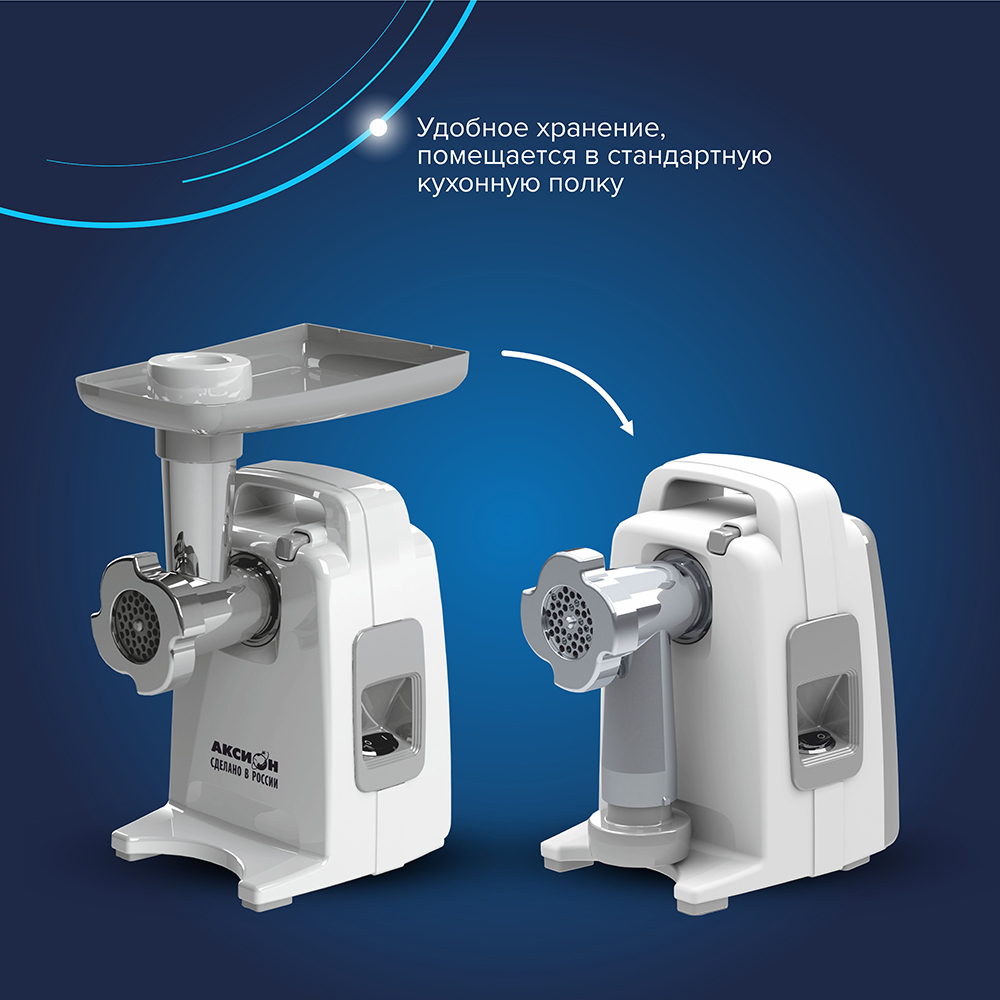 Первая малошумная электромясорубка М321 «Аксион». Благодаря низкому уровню шума, данную модель оценят родители с маленькими детьми - можно легко готовить пока ребенок спит. Отличается от всех линеек стильным дизайном и компактными размерами, она не требует дополнительного места хранения. Мясорубка легко помешается в стандартную полку.