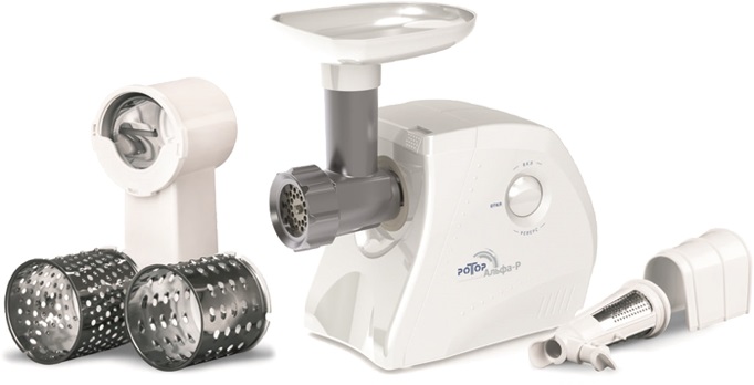 Электрическая мясорубка "Ротор-Альфа-Р" способна заменить кухонный комбайн, поскольку может приготовить фарш, натереть, нашинковать или тонко нарезать овощи, фрукты и сыр. Мясорубку можно использовать как соковыжималку для ягод, мягких фруктов и овощей. Оснащена приставкой-мясорубкой, соковыжималкой, 2 насадками овощерезки,1 приставкой-теркой.