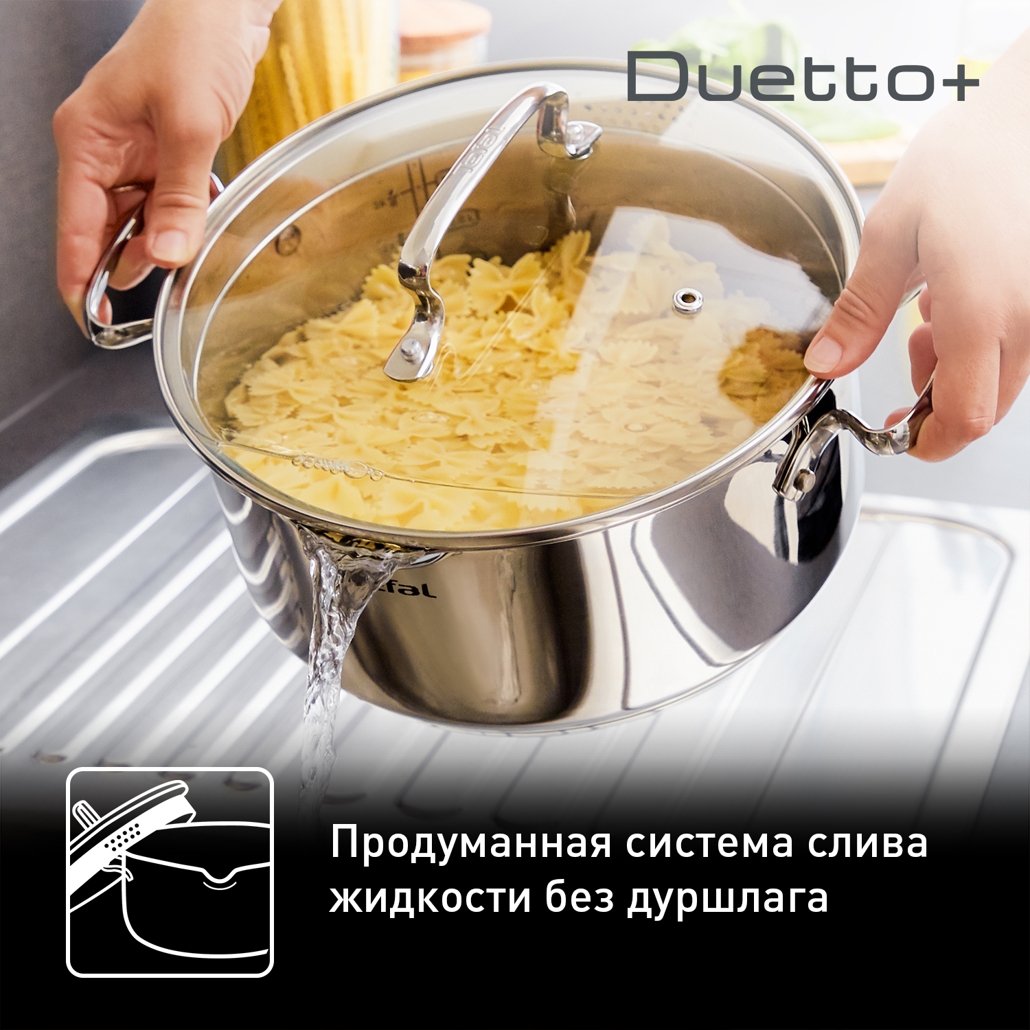 Многофункциональная посуда Duetto+ — это серия удобных кастрюль, выполненных в продуманном дизайне для быстрого и легкого приготовления любых блюд. Кастрюля изготовлена из нержавеющей стали премиального качества, которая отличается надежностью и долговечностью, и имеет гарантию 10 лет. На внутренней стенке расположена удобная и хорошо различимая мерная шкала для точного определения объема и количества ингредиентов. Кастрюля имеет специальные носики для комфортного слива лишней жидкости. В дополнение к ним стеклянная крышка оснащена специальными отверстиями — крупными с одной стороны и мелкими с другой, — чтобы было удобно сливать воду с пасты или риса. Прочные ручки с надежным заклепочным креплением обеспечивают безопасное использование, а элегантный дизайн посуды станет дополнением на любой кухне. Кастрюлю можно использовать на всех типах плит, включая индукционные. Посуда Duetto+ поможет готовить легко и быстро, чтобы вы могли больше времени проводить с близкими людьми.