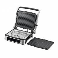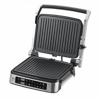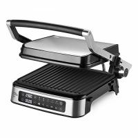 Контактный электрический гриль со съемными антипригарными панелями, таймером и электронной панелью управления с программами автоприготовления.