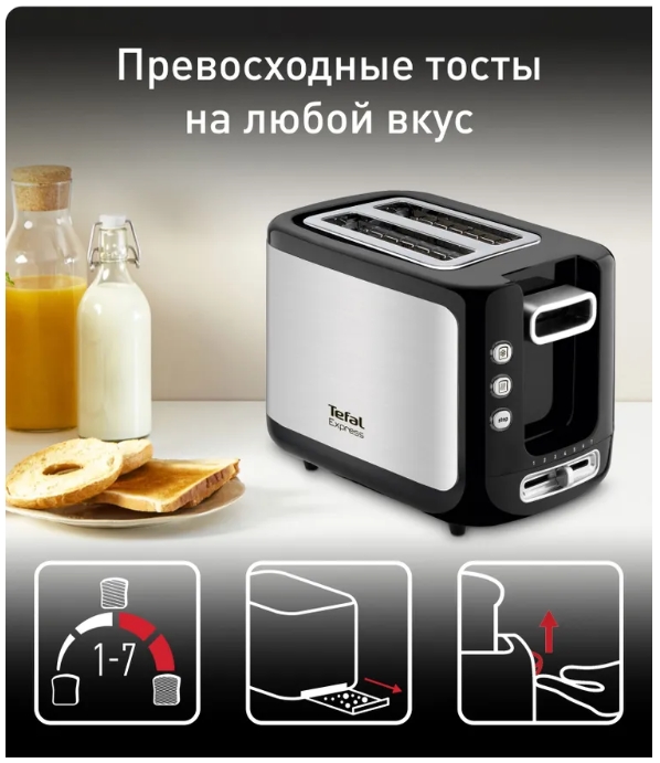 Познакомьтесь с тостером Express - ярким помощником с продуманным функционалом, с помощью которого на вашем столе каждый день будет вкусные и хрустящие тосты! Он очень прост и удобен в использовании: два широких отсека для хлеба любого размера; регулировка степени поджаривания хлеба от 1 до 7 для таких тостов, как вы любите; кнопка отмены для остановки процесса приготовления тостов на любом этапе; функция разморозки для равномерного разогрева замороженного хлеба; функция подогрева для поддержания температуры готовых тостов; удобный поддон для крошек для удобной очистки; приподнимите ручку, чтобы удобно вынуть готовые тосты; мощность - 850 Вт.