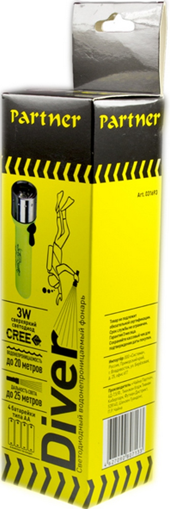Фонарь Partner Diver 3W, зеленый, акб 4хАА водонепроницаемый
