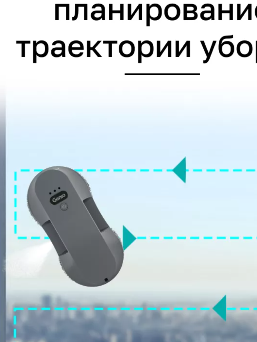 Ультратонкий корпус Высота корпуса всего 6,2 см, что позволяет использовать робот даже на окнах с решеткой. Интеллектуальное построение маршрута Электронное устройство - стекломойщик чистит и полирует любые гладкие и шероховатые поверхности. Робот для мойки окон Genio Windy 220 Пылесос и комплектующие: чистящие салфетки - насадки из микрофибры, пульт дистанционного управления, блок питания - адаптер с удлинителем, пульвер, инструкция
