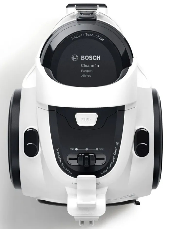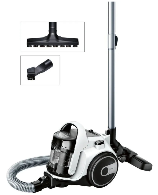 Пылесос Bosch BGS05A222 выполнен в бело-черном корпусе и использует металлическую трубу всасывания. Наряду со шнуром длиной 6 м она повышает радиус действия до 9 м. Большие колеса, ручка и облегченная конструкция пылесоса обеспечивают его легкое перемещение по разным поверхностям. Высокая эффективность прибора обусловлена применением технологии AirCycle, которая образует мощные вихревые потоки. Циклонная технология отсеивает частицы пыли и мусора в контейнер, создавая центробежную силу внутри. Для сбора мусора Bosch BGS05A222 использует съемный контейнер объемом 1.5 л. Даже при заполнении контейнера достигается высокая эффективность уборки. Обладая мощностью 700 Вт, устройство фильтрует воздух перед его попаданием обратно в помещение. Для экономии пространства и удобства хранения прибора его шнур сматывается автоматически. Эффективность уборки разных поверхностей увеличивает комплект насадок. Это двухрежимная насадка для пола, насадка для мебели, щелевая насадка, которая поможет очистить от мусора и пыли углы, поверхность под кроватью и диваном, плинтусы.