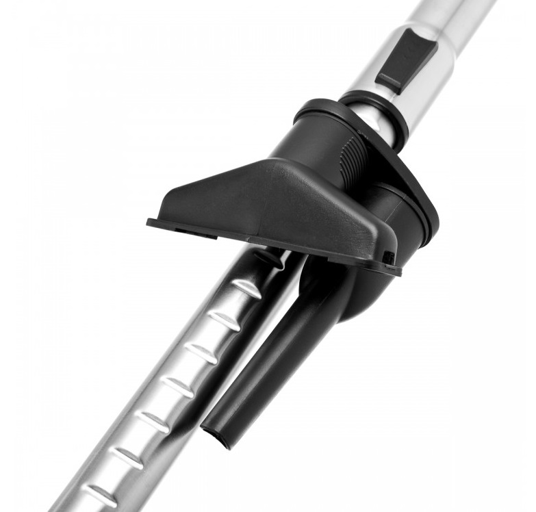 Пылесос с безмешковой технологией сбора пыли "циклон", резервуаром объемом 4 литра, металлической телескопической трубкой и регулятором силы всасывания на корпусе.