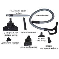 Комплектация: пылесос, универсальная щетка «ковер/пол», мини-щетка ТУРБО, щелевая насадка, насадка для штор, насадка для мягкой мебели, держатель для аксессуаров, гарантийный талон, инструкция на русском языке