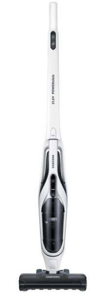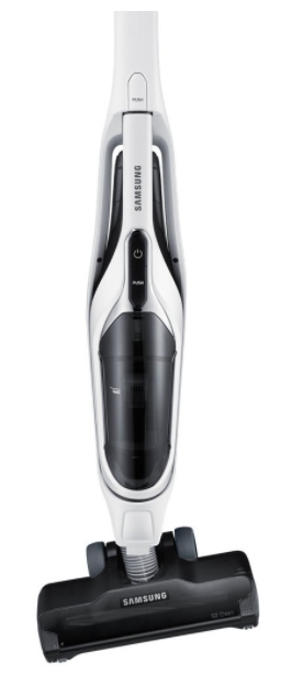 Достаточно продвинутый и многофункциональный вертикально-портативный пылесос, произведенный популярным южнокорейским брендом Samsung. Внешне устройство выглядит как обычная вертикальная модель для сухой уборки помещений, но стоит отделить трубу, как пылесос «превращается» в невероятно удобную портативную модель, которую во время работы легко можно удерживать на весу. Имеет съемный литий-ионный аккумулятор, который обеспечивает до 30 минут полностью автономной работы. При этом для полной зарядки ему нужно около 3 часа. В комплектации предусмотрен классический набор насадок, включающий стандартную комбинированную щетку для пола и ковровых покрытий, а также щелевую, пылевую насадки и турбощетку. Пылесос Samsung Power Stick VS-60K6051KW оснащен небольшим циклонным пылесборником объемом 0,25 л. Также предусмотрен съемный моющийся фильтр тонкой очистки. Щетка способна вращаться на 180°, что помогает справляться с препятствиями и удалять пыль возле углов мебели. Предусмотрена удобная возможность вертикальной парковки, то есть, конструкция пылесоса автоматически выравнивает его положение, чтобы он не падал. Несмотря на достаточно высокий уровень шума — 83 дБ, устройство можно назвать очень эргономичным, ведь, помимо перечисленных плюсов, оно еще и очень легкое — весит всего 2,7 кг.