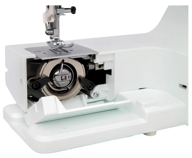Данная модель оборудована вертикальным качающимся челноком. 25 выполняемых операций , среди которых есть и трикотажные строчки. Помимо этого, присутствует возможность выметывания петли в полуавтоматическом режиме, а также имеется съемная рукавная консоль, яркая светодиодная подсветка, регулятор длины стежков и кнопка реверса.