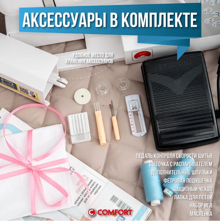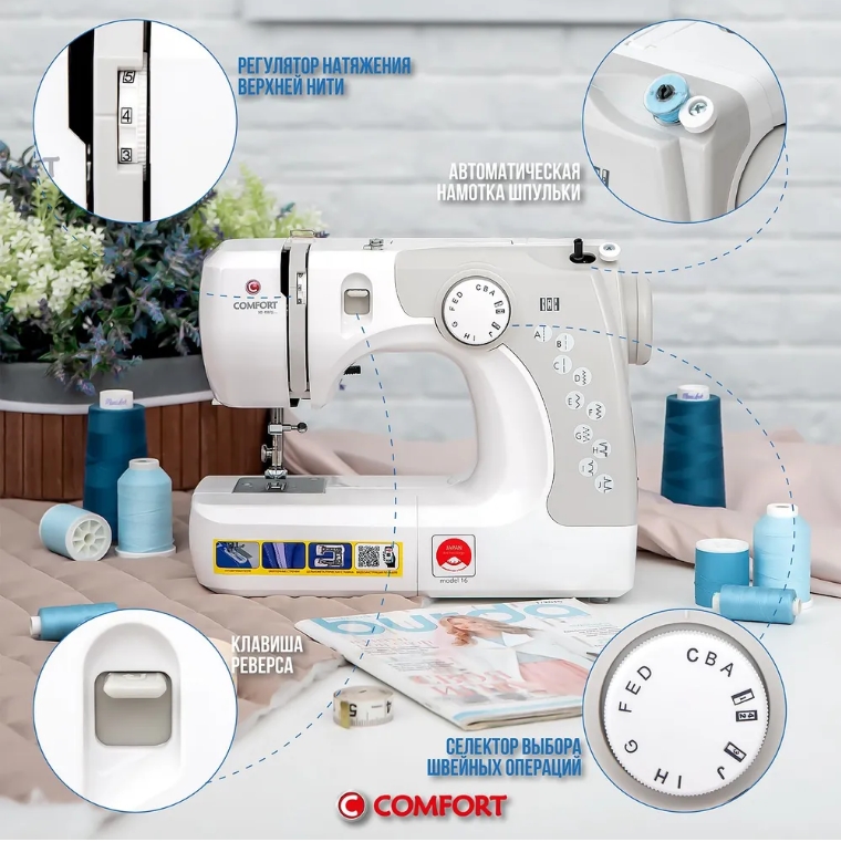 Вид строчки: Зигзаг, Прямая строчка, Закрытая имитация оверлочной строчки, Открытая имитация оверлочной строчки, Декоративная эластичная строчка, Трикотажная строчка, Тройной усиленный зигзаг