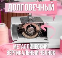 Самая простая в управлении швейная машинка. Специально адаптирована для шитья плотных тканей - у нее металлические рама, челночный узел и лапкодержатель. Шитье, подшивка и штопка и ремонт любых изделий из джинсы, замши, мягкой кожи и гобелена – все это по силам этой «универсальной» малютке.