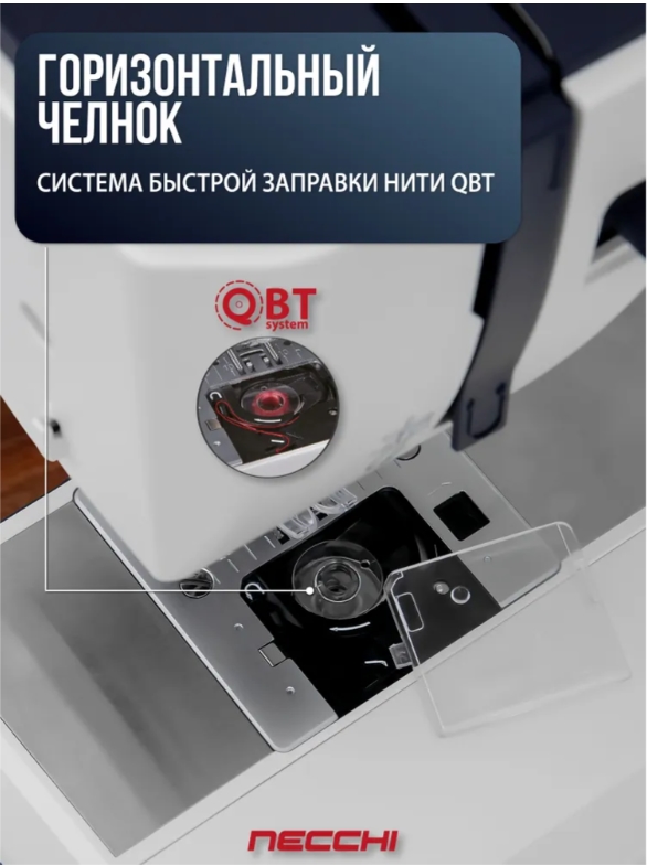 Горизонтальный челнок с системой быстрой заправки нити QBT. После заправки нижней нити вы можете сразу начать шить без подъема нижней нити, как у обычных швейных машин.