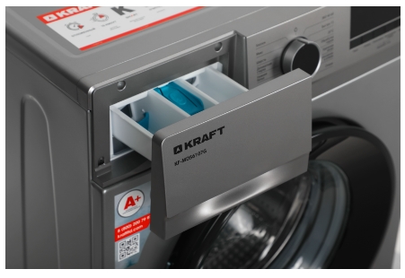 Стиральная машина KF-MDS6107G с загрузкой белья до 6 кг оснащена 15 программами стирки, максимальная скорость отжима составляет 1000 оборотов в минуту.  Модель обладает функцией отложенного старта, системой защиты от перелива и блокировкой от детей, автоматическим перераспределением белья, контролем пенообразования, а также обработкой пара.