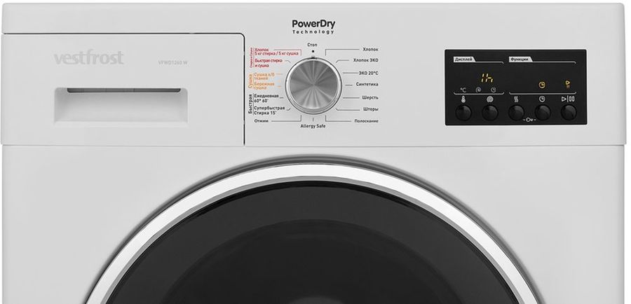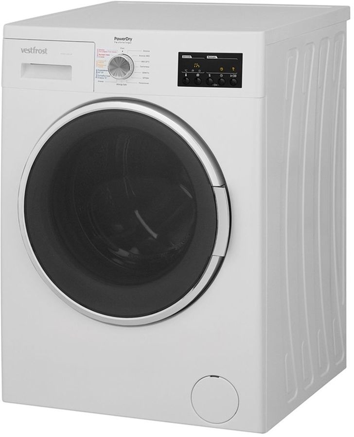 Максимальная загрузка стиральной машины VESTFROST VFWD 1260 W равна 7 кг. На сушку можно загрузить до 5 кг белья. Отжим осуществляется на максимальной скорости до 1200 оборотов за одну минуту. Этот показатель можно регулировать. Диаметр загрузочного люка составляет 47 см. Уровень шума при стирке не превышает 58 дБ, а при сушке — 76 дБ. Объем барабана в этой модели достигает 60 л. Есть 15 программ стирки.