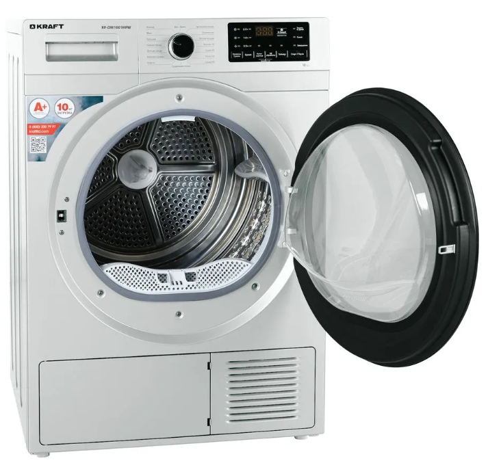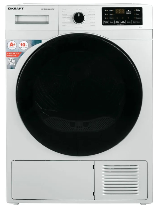 Сушильная машина Kraft KF-DM1001HPW в белом цвете позволяет за один раз  высушить до 10 кг белья. Функция K-Smart  сама определит наиболее подходящую программу для сушки белья.