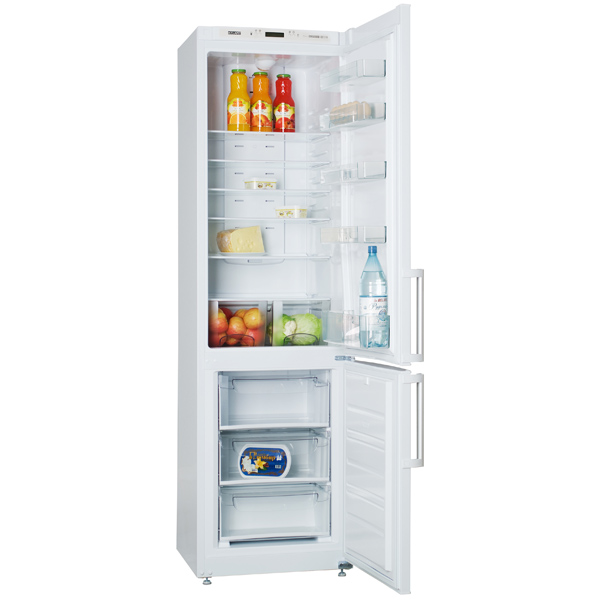 Двухкамерный холодильник «Атлант» ХМ 4426-000 N – вместительная модель, общий объём которой – 357 литров. Если у вас большая семья или вы не любите тратить много времени на походы в магазин и предпочитаете закупаться впрок, этот прибор – то, что вам нужно. ВНУТРЕННЕЕ ОСНАЩЕНИЕВ верхнем отделении – пять стеклянных полок, четыре из которых можно регулировать по высоте. «Семейная» кастрюля с супом, коробка с тортом, трёхлитровая банка с домашними маринадами – всё поместится. Фрукты и овощи можно разложить отдельно, так как контейнера для них два. В дверные «балконы» встанет и подставка для яиц (в комплекте), и бутылки, и консервы. ДЕЙСТВУЕТ ПО СИТУАЦИИТемпературу в обеих камерах отображает цифровой дисплей. На нём же высвечиваются обозначения дополнительных функций. Собираетесь уехать на две-три недели? Вам пригодится режим «Отпуск»: в холодильной камере температура будет поддерживаться на уровне +15 градусов (продукты следует заранее вынуть), чтобы избежать появления неприятных запахов.ПОЛЕЗНЫЕ ОСОБЕННОСТИЕсли вы продержите дверцу открытой более одной минуты, прозвучит звуковой сигнал. Дверцы можно перенавесить на удобную вам сторону.УНИВЕРСАЛЬНОЕ РЕШЕНИЕДизайн «Атлант» ХМ 4426-000 N Wh прост: на белом цвете корпуса эффектно выделяются серебристые ручки. Но в этой лаконичности есть преимущество: эта модель органично впишется практически в любой современный интерьер