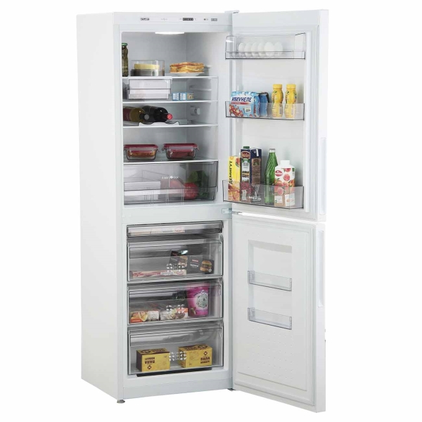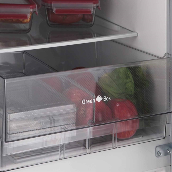 Передние стенки трёх выдвижных ящиков сделаны из прозрачного пластика, так что вы сразу увидите, где что лежит. В период сезонных заготовок замораживаете ягоды? Чтобы они не помялись, используйте специальный поддон. На дверце – два «балкона» Slim Space, куда поместятся плоские упаковки, например, с пиццей или тестом. Прилагается форма, в которой вы сможете приготовить лёд для напитков.