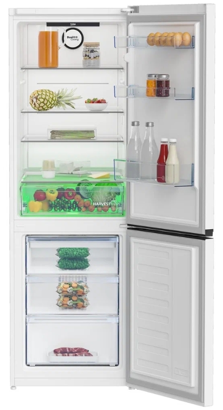 Двухкамерный холодильник с нижней морозильной камерой и общим объемом 320 л оснащен двухконтурной системой охлаждения NoFrost Dual Cooling (Ноу Фрост), которая разделяет воздушные потоки в холодильной и морозильной камерах и не допускает смешивания запахов и образования льда на стенках. Холодильник не нужно размораживать, а специальный режим «Отпуск» снижает потребление электроэнергии, если вы не пользуетесь им долгое время. Ящик для фруктов и овощей в холодильнике Beko дополнен технологией 3-х цветов HarvestFresh, благодаря которой продукты дольше сохраняют свежесть, натуральный вкус и витамины.