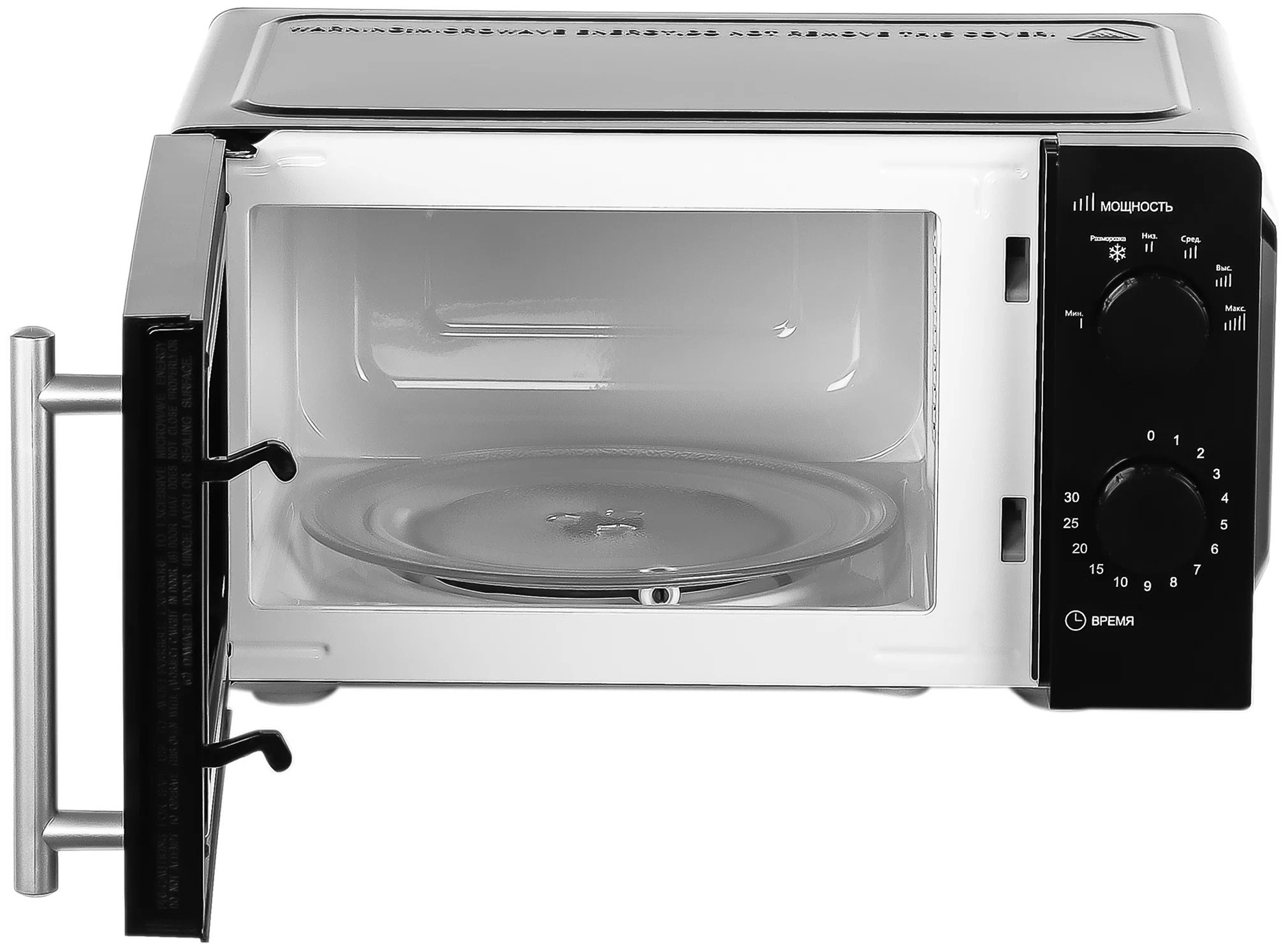 Компактная СВЧ печь в корпусе черного цвета с механическим управлением 6-ю уровнями мощности, камерой объемом 17 литров и таймером со звуковым сигналом окончания приготовления.