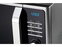 Микроволновая печь станет украшением вашей кухни благодаря стильному дизайну с черной стеклянной лицевой панелью, дисплеем синего свечения и серебристым переключателем.