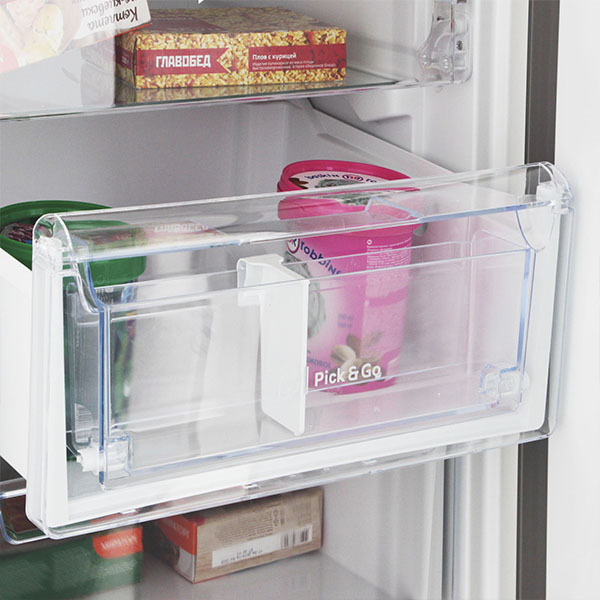 Внутреннее пространство удобно организовано. Для продуктов предусмотрены пластиковые ящики с прозрачными стенками, поэтому вы без труда определите, что лежит в каждом из них, и сможете быстро найти то, что понадобилось в данный момент.
