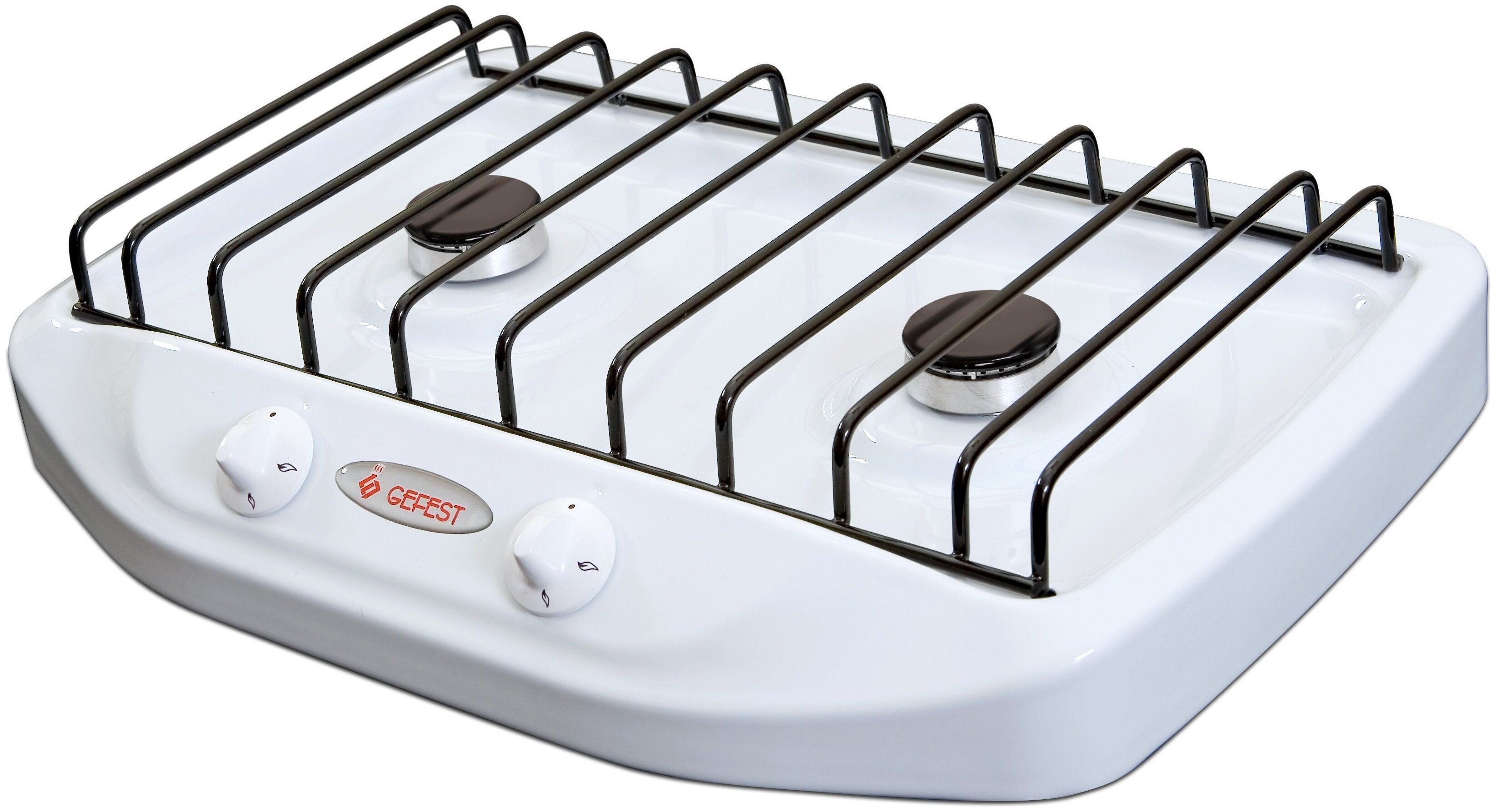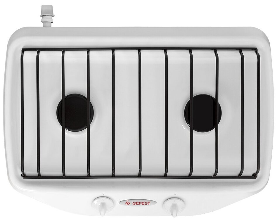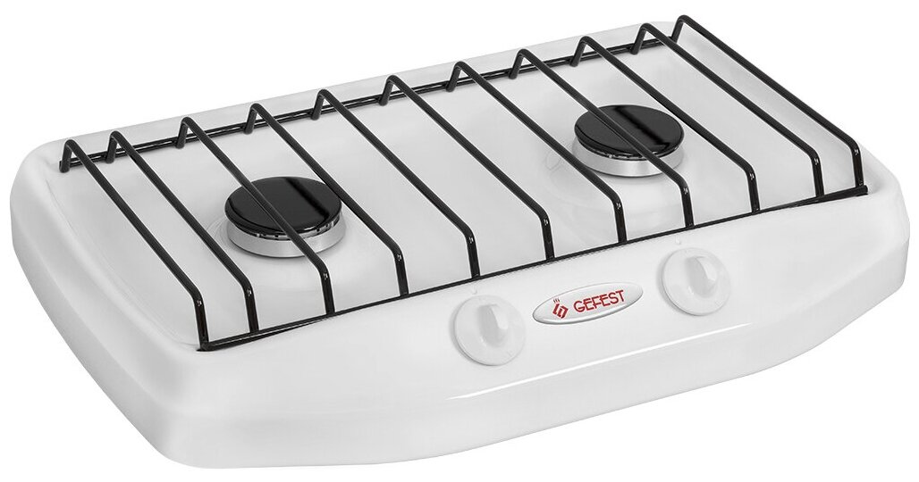 Газовая плитка Gefest 700-03 оснащена двумя конфорками. Управлять работой устройства можно с помощью поворотных переключателей.