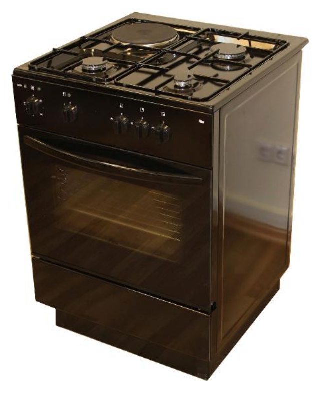 Плита оборудуется четырьмя конфорками мощностью от 2 до 3,2 кВт. Устройство обладает автоматическим электроподжигом. Прибор оснащается духовкой объемом 64 л с термостатом и двухслойным стеклом дверцы. Мощность гриля составляет 1500 Вт. Есть режим конвекции.