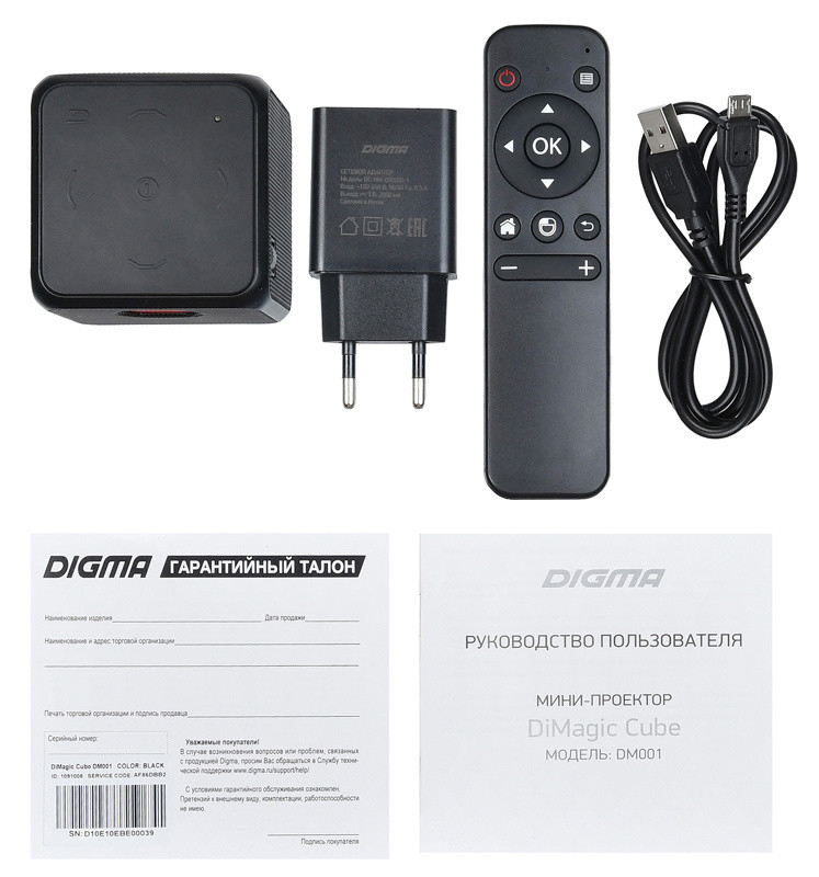 Комплектация Мини-проектор DiMagic Cube Micro-USB-кабель Адаптер питания Пульт дистанционного управления Руководство пользователя Гарантийный талон