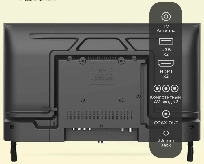 Телевизор оснащен всеми необходимыми разъемами. Кроме того, в него встроены две колонки суммарной мощностью 6 Вт.