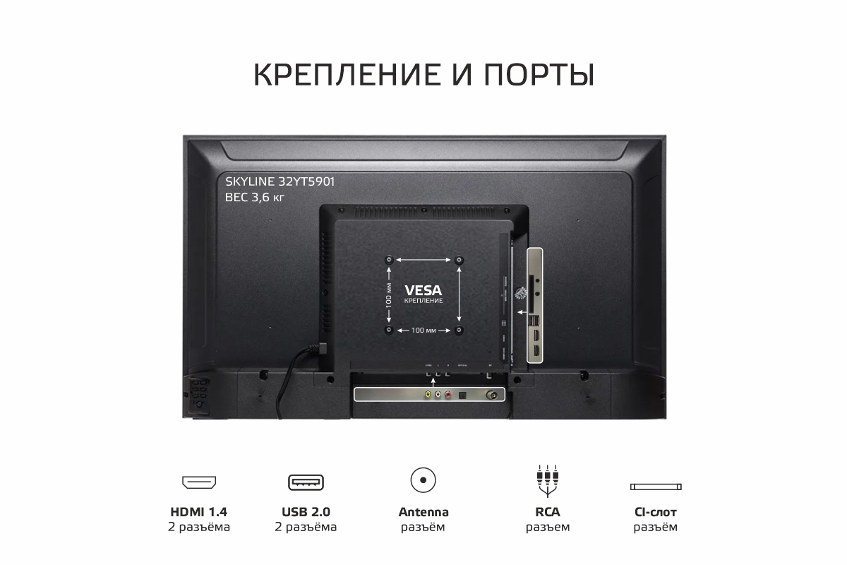 SKYLINE 32YT5901 – это компактный, безрамочный, функциональный и ультратонкий жидкокристаллический телевизор, предоставляющий практически все современные возможности для работы с медиаконтентом. Телевизор поддерживает аналоговое, цифровое эфирное и цифровое кабельное вещание. Его также можно подключить к другим внешним устройствам (плееры, приставки, консоли для игр и т. п.). С ним вы сможете обойтись без стороннего медиаплеера. К встроенному порту USB можно подключать жесткие диски или накопители USB-Flash с записанными на них видео, музыкой, изображениями или даже текстом. Эфир любимого канала/программы легко и просто записать с линии (должен быть подключен высокоскоростной диск) или по заранее определенному расписанию. Вам доступны: удобный интерфейс на русском языке, поддержка телетекста, управление доступом и многое другое.