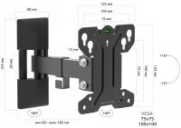 ТВ кронштейн  Harper TVF-32 совместим со стандартами VESA 100x100 и 75x75 (телевизоры с диагональю от 10 до 32 дюймов). Harper TVF-32 имеет неразборную конструкцию и обеспечивает достаточную гибкость в регулировании положения телевизора. Поворот влево/вправо – до 180 градусов, наклон – +/-15 градусов относительно вертикали, приближение к стене / удаление от неё (минимальное расстояние до корпуса – 60 мм, максимальное – 185 мм).
