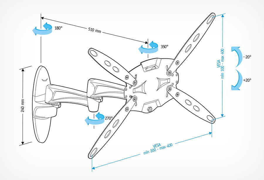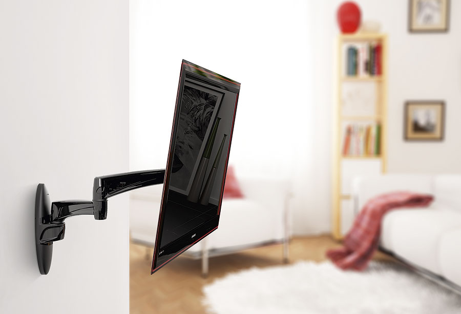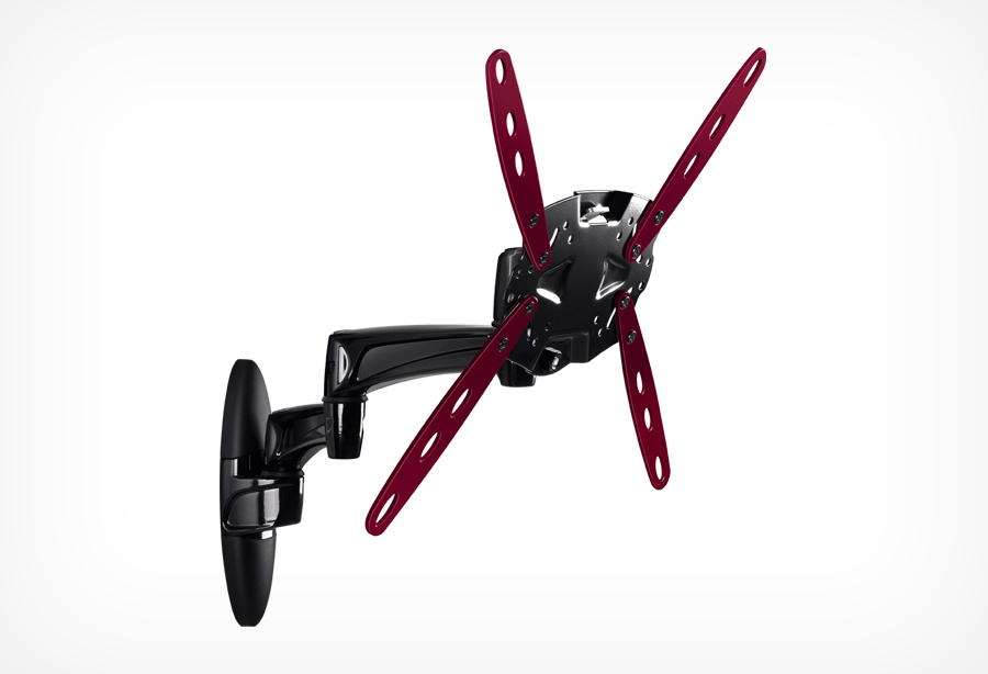 Принципиальное отличие этой модели в том, что она обеспечивает максимально широкий угол обзора телевизора. При просмотре телевизор можно повернуть в любую сторону, при этом он не упрется в стену благодаря наличию двух колен в конструкции кронштейна.