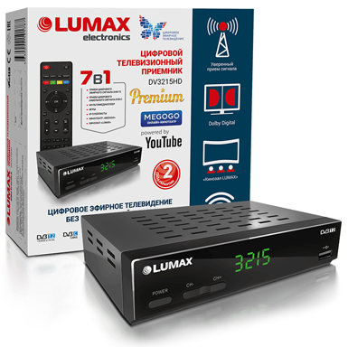 Lumax DV3215HD обеспечивает уверенный и четкий прием цифровых сигналов стандартов DVB-T/T2 и DVB-C, имеет высокопроизводительный процессор GX3235S, сверхчувствительный тюнер RT850, который обеспечивает с быстрый захват сигнала и высокую скорость переключения каналов. Аппарат можно подключить к любому телевизору при помощи аудио-видео шнуров, ПДУ аппарата обучаемый.