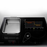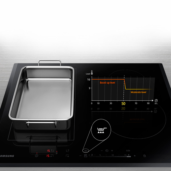 Зона нагрева AnyDish. Индукционная варочная поверхность Samsung имеет зону AnyDish, которая обладает прямоугольной формой, разработанной специально для приготовления нескольких блюд одновременно. На ней могут разместиться кастрюли и сковородки различных размеров, а также посуда с нестандартными габаритами. Теперь приготовить большое блюдо в утятнице для семейного обеда значительно проще.