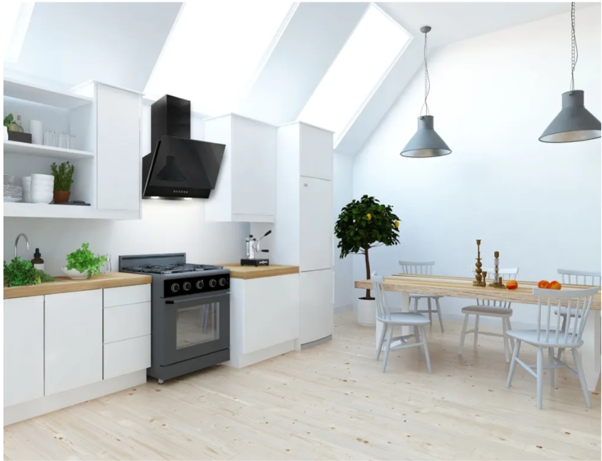 Лаконичные детали корпуса придают вытяжке изысканный вид. Наклонная форма позволяет максимально эффективно использовать пространство над варочной поверхностью.