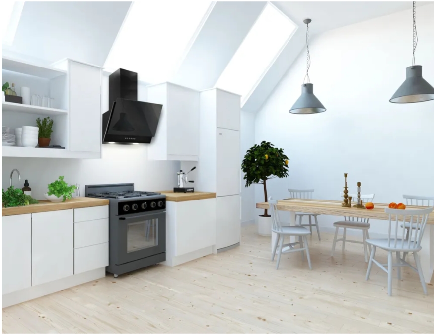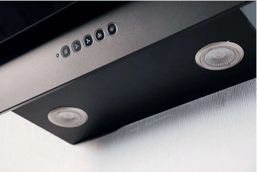 Лаконичные детали корпуса придают вытяжке изысканный вид. Наклонная форма позволяет максимально эффективно использовать пространство над варочной поверхностью.